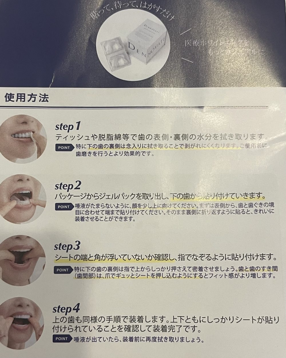 使い捨てシートを貼って、90分ほど待って、はがすだけでホワイトニングができます。