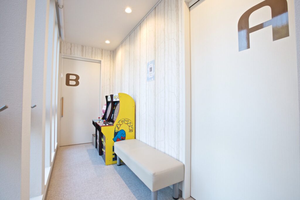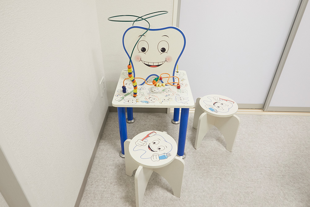 個室の診療室内にキッズコーナーを設置。親御さんが治療中、お子様はその隣で遊んでお待ちいただけます。