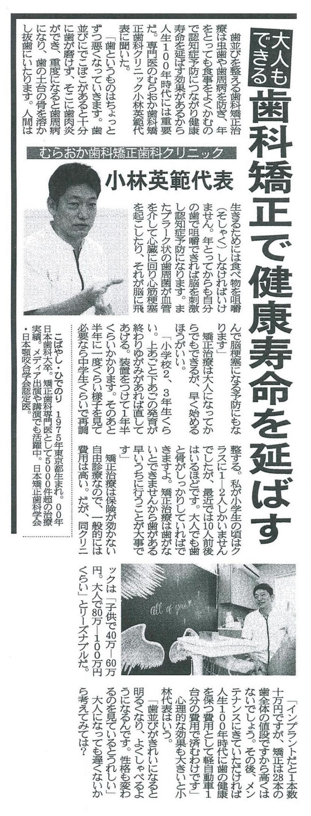 人生100年時代と言われる中で、健康で寿命をのばすことが大切になってきます。矯正の観点から健康寿命に関してのインタビューを受けた小林英範のインタビュー記事が「gooニュース」「Antenna」「グノシー 」などに掲載されました。