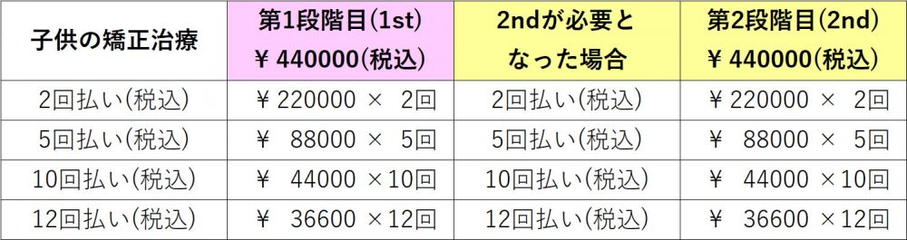 子供の矯正治療(混合歯列期)![]() | 第一段階(拡大床)、ワイヤー、リテーナー | ¥440,000 |