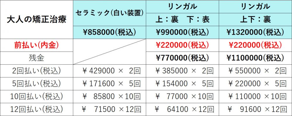 | 舌側矯正:矯正上下とも裏側の装置 | ¥1,320,000 | |