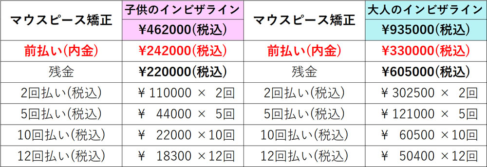 マウスピース型矯正装置(インビザライン)分割払い料金(子ども・大人)